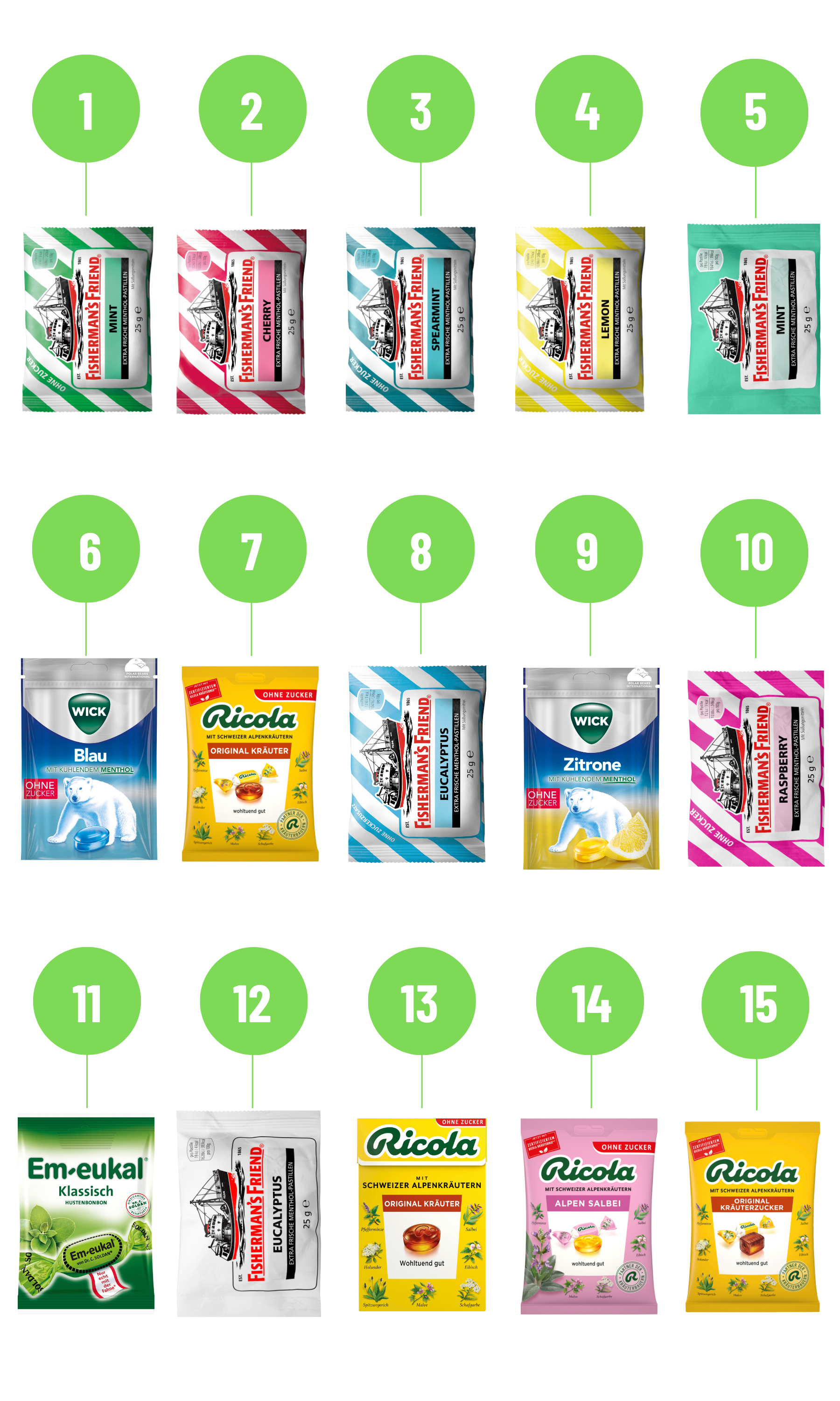 Die aktuelle Analyse zeigt deutlich, dass Menthol-, Kräuter- und zuckerfreie Varianten den Markt der Hustenbonbons weiterhin klar dominieren. Vor allem Fisherman’s Friend ist mit mehreren Sorten stark vertreten und liefert die Spitzenpositionen im Ranking. Ricola bleibt mit den Schweizer Kräuterbonbons – sowohl im Beutel als auch in der Box – ein zentraler Klassiker im Sortiment und ergänzt das Angebot mit Sorten wie Alpen Salbei. Gerade durch den TV-Spot mit dem Slogan „Wer hat´s erfunden?“ ist Ricola in den Köpfen der Verbraucher und in aller Munde.