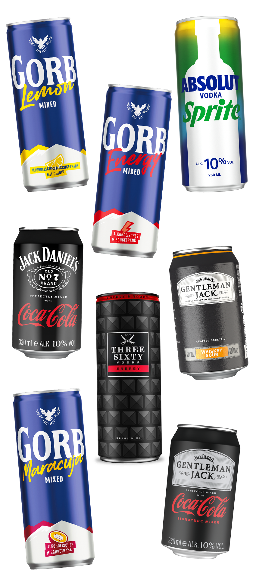 Vodka-basierte Ready-to-Drink-Varianten zählen weiterhin zu den zentralen Impulsartikeln im Segment. Produkte wie Absolut Vodka Sprite, Wodka Gorbatschow & Energy, Wodka Gorbatschow & Lemon, Wodka Gorbatschow & Maracuja, Effect Vodka + Energy sowie Three Sixty Vodka Energy und Three Sixty Vodka Energy Zero basieren klar auf Vodka als Spirituosenkern und kombinieren diesen mit unterschiedlichen Mixern – darunter Softdrinks, Fruchtvarianten oder Energy-Drinks.