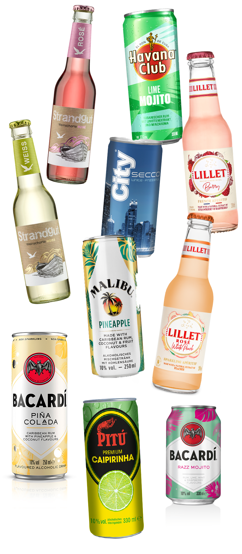 Fertige Cocktails wie Bacardi Piña Colada, Bacardi Razz Mojito, Pitu Premium Caipirinha oder Malibu Pineapple stehen für bekannte Geschmacksprofile und hohen Wiedererkennungswert. Longdrinks wie Havana Club & Cola oder Havana Club Lime Mojito greifen ebenfalls etablierte Rezepturen auf und eignen sich besonders für spontane Kaufentscheidungen sowie den unmittelbaren Konsum.