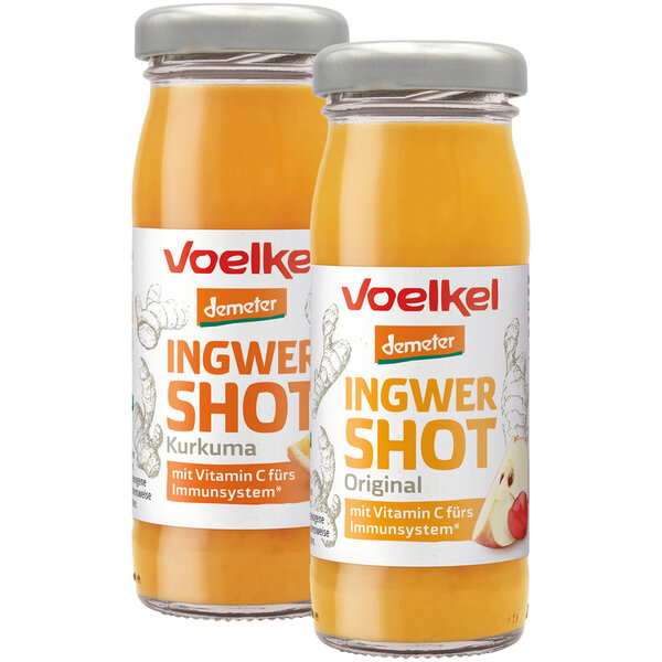 Die beliebten Voelkel Ingwer Shots sind jetzt neu bei uns erhältlich – mit fair gehandeltem Direktsaft und in bewährter Demeter-Qualität für den natürlichen Immun-Kick. Ob „Original“ mit der reinen Kraft des Ingwers oder „Kurkuma“ mit fruchtiger Orange und einem Hauch Würze – beide Sorten liefern dank natürlichem Vitamin C aus der Acerolakirsche 100 % des Tagesbedarfs pro Shot (95 ml). Die Rezepturen überzeugen durch intensive, aromatisch-scharfe Noten und kommen komplett ohne Konzentrate oder Zusätze aus.